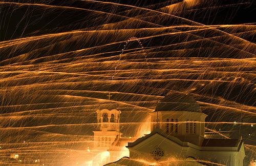 25.April 26, 2008. 希腊东爱琴海岛屿希俄斯 . 在希腊东正教复活节庆祝活动中火箭飞越圣马可教堂钟楼 . 敌对的教区每年复活节互相对对方教堂钟楼发射数千发火箭是百年历史的传统