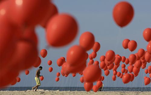 32.June 27, 2008. 里约热内卢的科帕卡巴那海滩示威者放置 4000 个红气球代表未来六个月中可能会遭受暴力的受害者