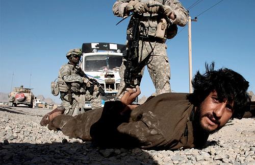 坎大哈附近美军士兵在一名阿富汗男子车内发现非法武器后进行搜身 , 此人为一家私人保安公司车队工作