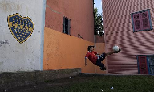 阿根廷布宜诺斯艾利斯 La Boca 附近一个小孩在踢球