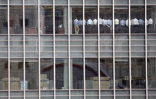 伦敦金丝雀码头金融区 , 工作人员站在雷曼兄弟公司办事处的会议室里