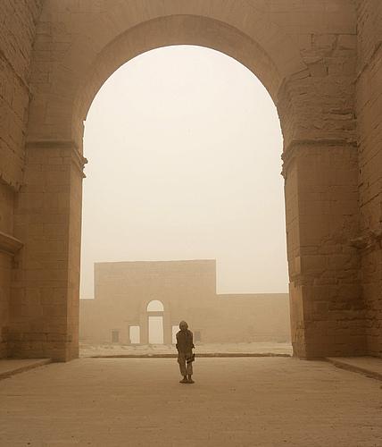 一名美军陆战队士兵与多国部队机械化小组第二轻型装甲侦察营 D 连穿过伊拉克的 Hatra 废墟 , 任务目标是处理该地区的分裂武装 , 防止敌人受到庇护 , 防止外国力量进入