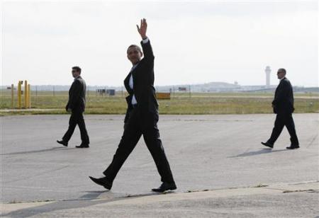 密苏里圣路易斯 , 民主党总统候选人参议员奥巴马在抵达时对 10w 支持者挥手