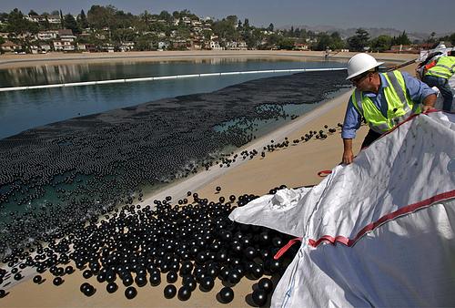 12、2008年6月9日,水利电力部的工人把40万个空心黑塑料球投放到巴里水库,以减少水面照射的阳光。因为当地的水里富含溴和氯,而长时间被阳光照射会生成溴酸钾等致癌物质