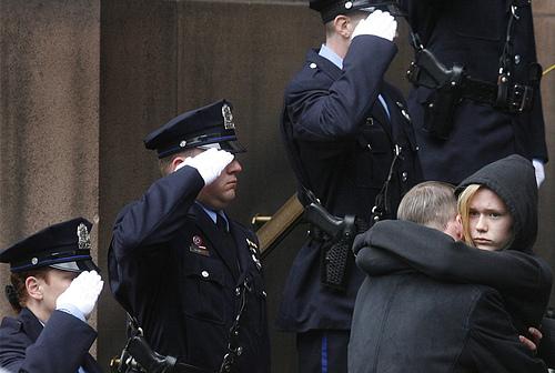 15.May 9, 2008. 费城警官 Stephen Liczbinski 的子女在他的葬礼上拥抱 . 警官 Liczbinski 在当月 3 日的一起银行抢劫中被射杀
