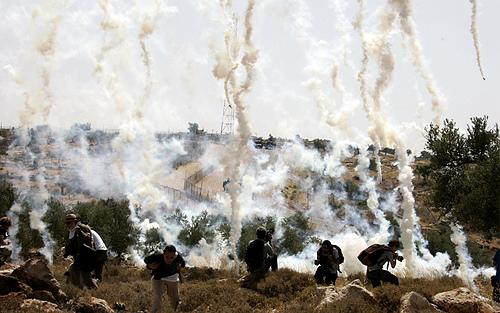 22.June 6, 2008. 在抗议建造隔离墙的活动中 , 以军士兵发射的催泪瓦斯罐落入抗议者人群