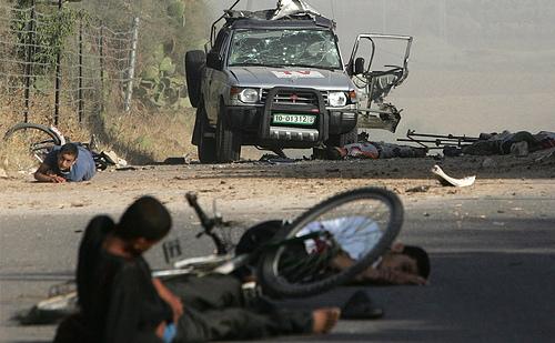 26.April 16, 2008. 以色列导弹袭击加沙中部 , 这是一名受伤的巴勒斯坦人躺在路透社记者车后