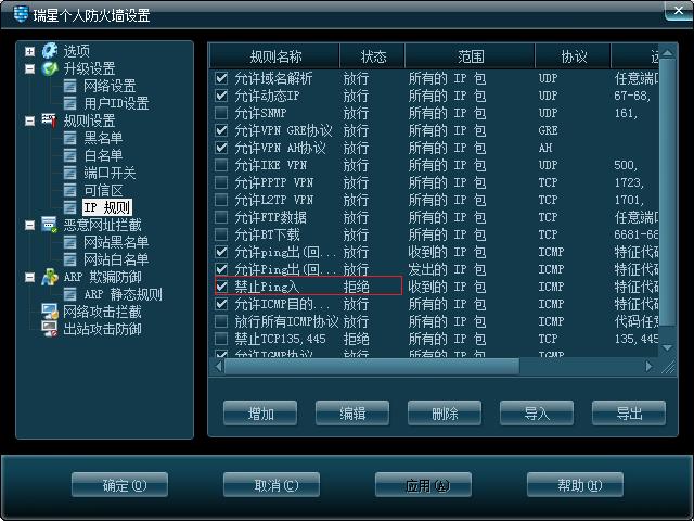 在ip包过滤里面我本来是想选择屏蔽arp的,但是发觉,没有arp这个协议,所以不知道怎么设了