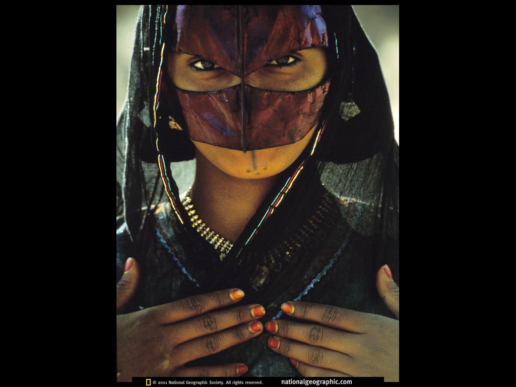 Ghareeba Hamed Said Fox al Harsousi像她国家的其他贝多因妇女一样戴着独特的阿曼面纱或面具。橘黄色的粉末使她的面容呈黄色。
