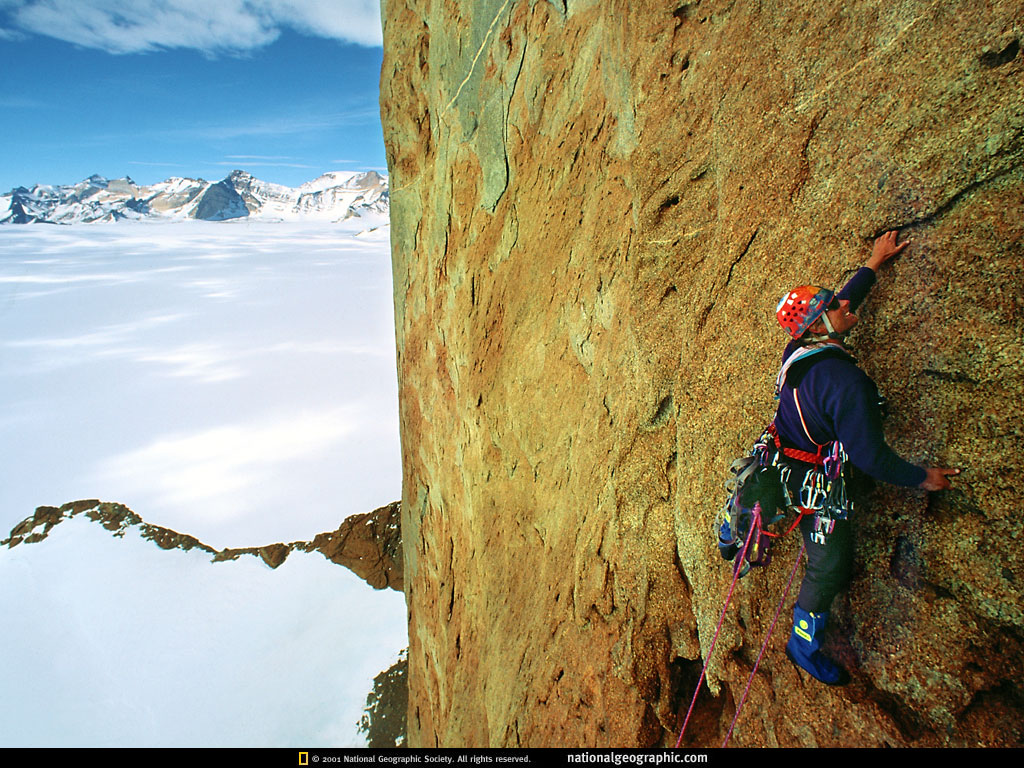 杰瑞德·奥登沿着一条艰苦铺设的绳索山道朝山峰攀登。斯图尔特峡谷的冰湖在山下延伸,它被大量无人攀登的无名山峰形成的一个堡垒包围着。摄影家戈登·威尔西说:“就像发现一个北极的约塞米蒂峡谷一样。”
