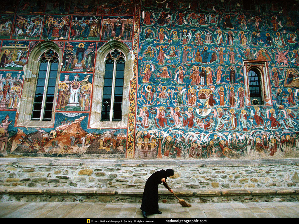 虔诚的信仰指引着一位摩尔多维察的修女。这座Vatra Moldovitei附近的罗马尼亚东正教堂修道院建立于1532年。墙上的插图为不识字的信徒描绘了历史传说和圣经故事。尽管***当局不禁止宗教信仰,但限制礼拜,有时甚至迫害信徒。在政权倾覆之后,进这个铺着石板路的教堂做礼拜的人又多了起来。