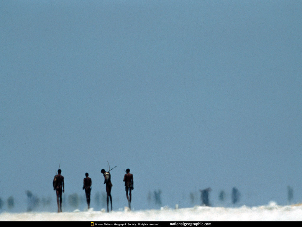 这是一幅海市蜃楼的图像,一群穿着兽皮,拿着弓箭的布希曼族人(Bushmen)穿越纳米比亚Nyae Nyae保护区(位于纳米比亚东北部)。由于枪支、狗以及马的使用受到限制,所以他们还是用传统的方法狩猎。他们居住在一个为吸引观光客而建的村庄中,大部分日子里他们穿的也是西式的衣服。