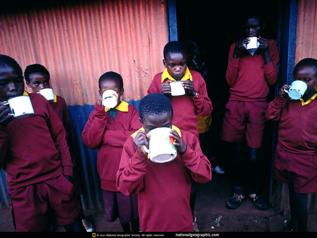 这群马赛儿童穿着由他们的母亲省吃俭用、努力工作才买到的校服,站在肯尼亚乡间的一所房子的门口喝早茶。