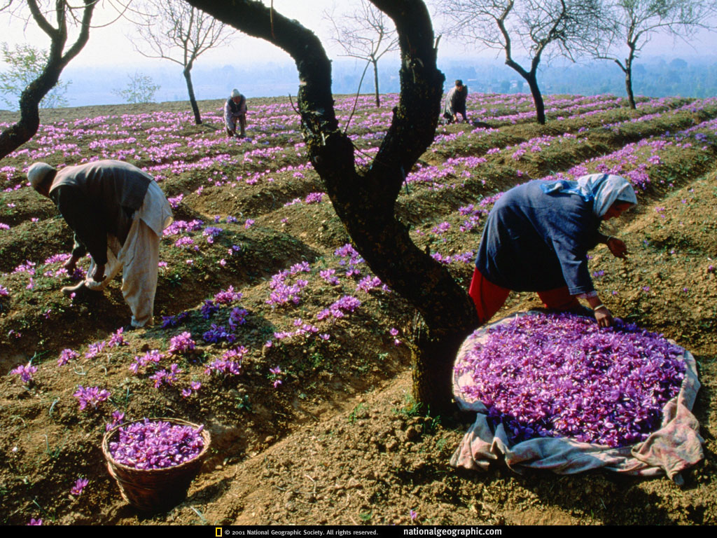 如果耐心摘取,能从每一朵藏红花的花蕊中采集三条鲜艳的石榴红细索状花茎。这是世界上最昂贵的香料,一英亩的产量仅为几磅。这里青葱的田野与平静的湖泊曾经每年吸引了超过50万的游客,但是国内动荡已打破了可什米尔的宁静,旅游业更是蹒跚前行。