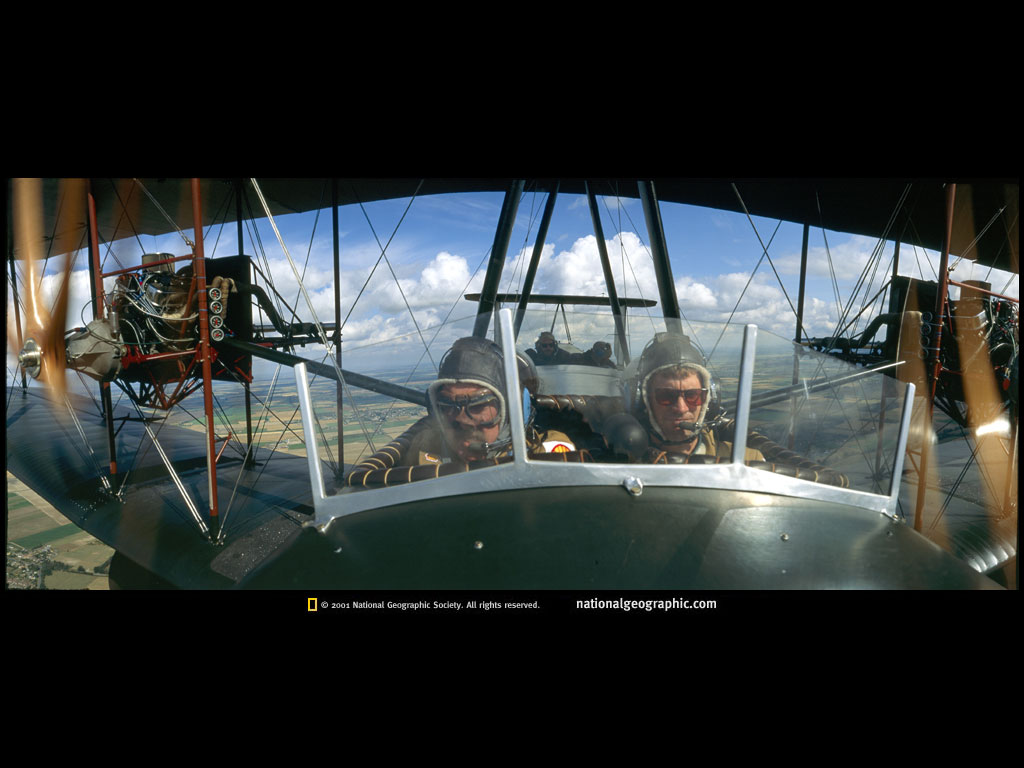 在开始降落到下方地面之前,美国的Peter McMillan(右)和澳大利亚的副驾驶员Lang Kidby 在英国上空详细检查引擎,测试他们的飞机。他们的维梅是1919年英国轰炸机的复制品,将检验大量的飞行。