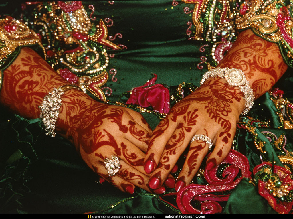 阿曼苏丹国因油田的财富而变得富裕,使它从阿拉伯半岛的穷乡僻壤蹿升为现代国家——同时仍然保留着他们的传统,如lailat al henna,这是婚礼前夕只有妇女参加的向新娘表达敬意的庆祝会。新娘的双手用指甲花染画着奇特的金银细丝图案,它们几周后才会消失。
