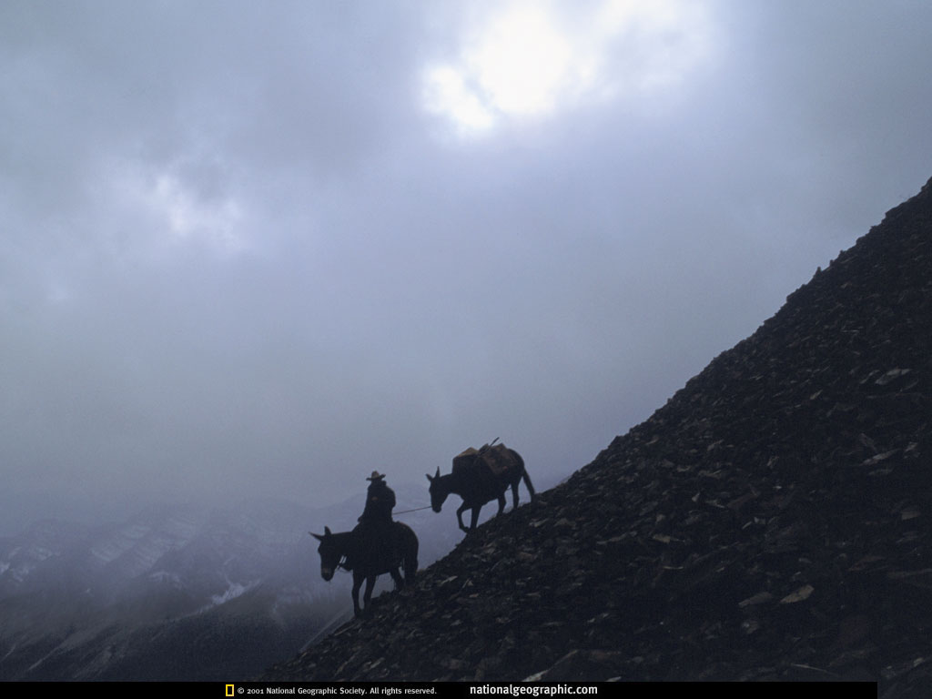 向导巴里.弗古森正小心翼翼地从班芙高地下山,他必须勇敢地面对这场九月暴雪。弗古森喜欢驴胜过驮马,正如他说的那样,驴在迈出它的脚步前会看、会思考。