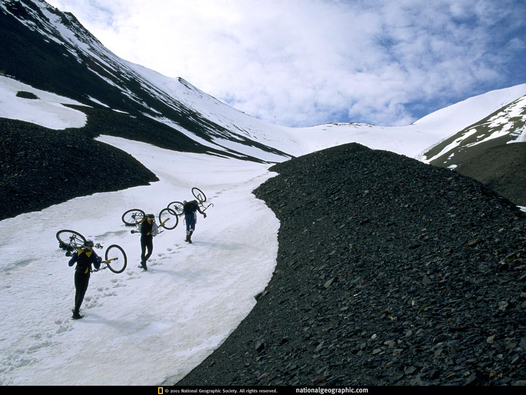 在他们为期7天,全程775公里(1247千米)跨越崎岖的阿拉斯加山脉的探险中,三个冒险者扛着他们的山地车。