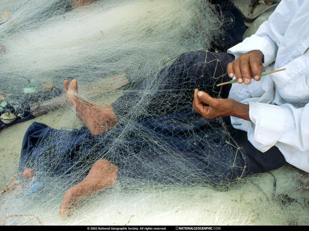 (埃及的亚历山大港,一位渔民正在修补渔网。)很多年前,渔民们喜欢在尼罗河的两个主要河口附近捕鱼。现在,由于河水的养料越来越少,而人口越来越多,鱼群迁往更远的海洋里生活,渔民也一样。