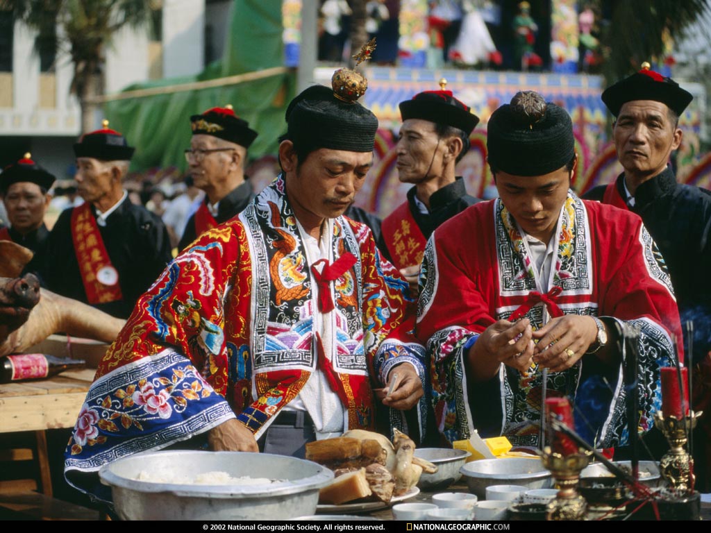 在一个祈求和平的道教庆典中,猪和羊摆在了各种祭品中。
