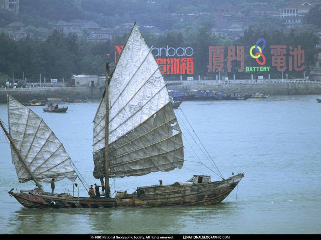 帆船(如图所示),在6个世纪前与印度通商贸易的船貌似就是这种。中国帆船在那个时代是世界最大的船之一。今天的帆船大多用来在扬子江(Yangtze River)运货。尽管中国四通八达的铁路和公路有极大的发展,但河流仍是重要的贸易渠道。