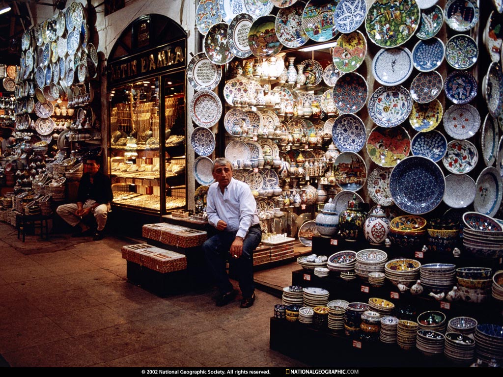 在伊斯坦布尔极富盛名的大集市(Covered Bazaar),一位店主在他的陶器店前展示他的货物。这个集市可追溯到15世纪,顾客可以在迷宫般的小巷和4000个商店中搜索想要的东西。