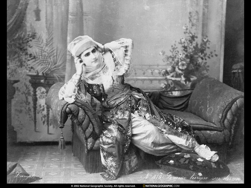 二十世纪早期,西方人对土耳其皇室女眷有着浓厚的好奇心,于是他们应顾客要求制作了这种别致的明信片(国家地理学会档案馆于1911年得到这张照片)。但是由于伊斯兰的传统禁止土耳其穆斯林妇女被丈夫以外的其他男人看到,所以摄影师有时会叫男人假扮成妇女拍照。
