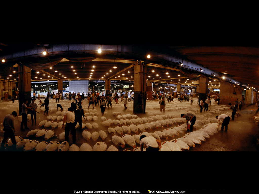 这些价值不菲的冰冻物资蓝鳍金枪鱼是为筑地鱼市的晨间拍卖准备的。筑地鱼市杂乱喧闹的店铺的陈列柜中有着各种各样的海产品——从鲜活的海鳗到盐渍的章鱼——同时也反映出了日本社会混乱中的井井有条。研究筑地的学者泰德 贝斯特说:“筑地就像日本料理一样,凸显了很多日本文化。”