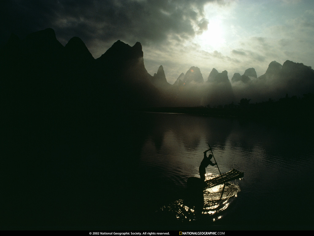 一个渔夫在漓江中用篙撑着竹筏,与作为背景的石灰岩山峰交相辉映。一次远古的海床抬高作用,再加上经历千百年风雨的侵蚀,才形成了这些秀丽的山峰,催生了大量的诗歌和艺术作品。