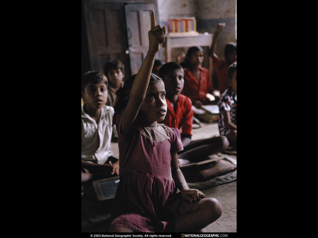 在Vadgam的乡村学校里,一个二年级或三年级的学生在课堂上举起她的手。当沙达沙洛伐水坝(Sardar Sarovar dam )竣工时,这个村子会被建水坝时产生的人工湖淹没。沙达沙洛伐水坝是纳尔默达河(Narmada River )水坝计划中的一个,这个计划旨在创造电力来源,饮用水,以及灌溉用水。
