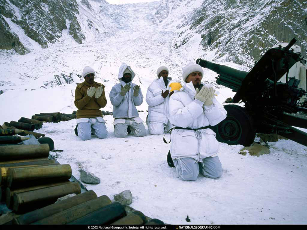 在喜马拉雅山脉的喀喇昆仑山,巴基斯坦士兵们正在用来对抗印度敌人的火炮旁祈祷。