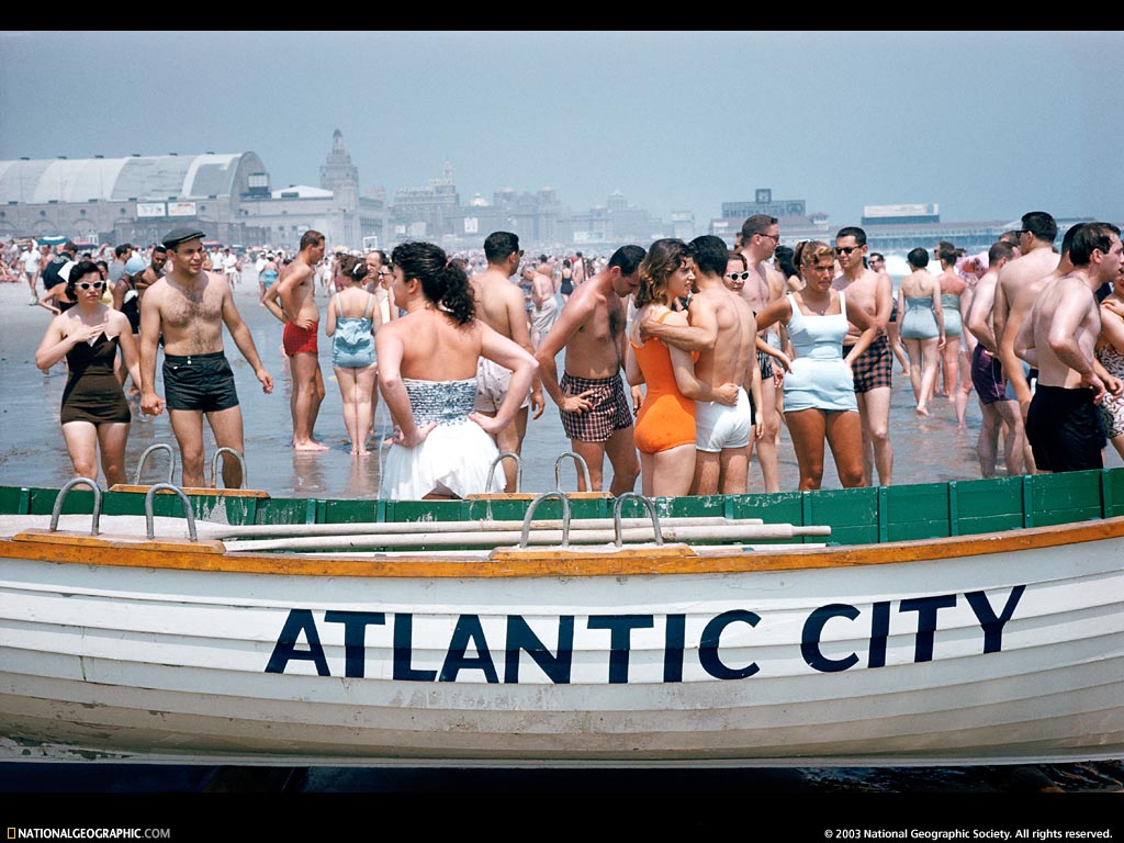 末游泳者挤满了大西洋城(Atlantic City)的海滩。每个夏季救生员要救起约1200个游泳者。会议厅(Convention Hall)坐落在左边,而钢铁码头(Steel Pier)就在右边。