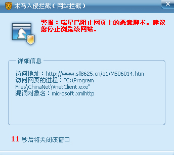 平均每2分钟出现一次,我应该怎么处理,到底是中了木马还是什么原因,我用瑞星查了系统,没提示有病毒。那个VnetClient.exe就是拨号上网的星空极速软件,我进了注册表查找sll8625.cn,也没有提示找到。
