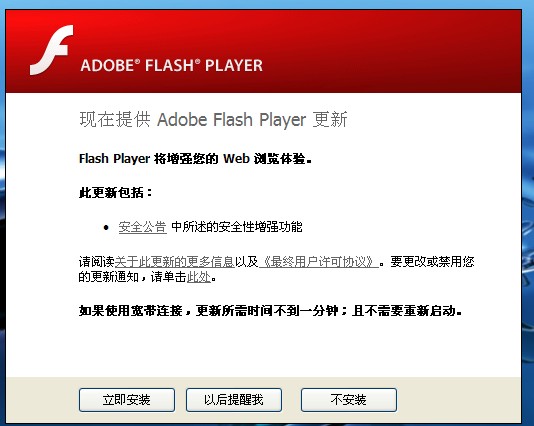 flash player 它会定时检测,如果有新版了,它会提醒你安装的,估计以后有新版本时也会出现这个画面,到时再安装下就行了:default5: