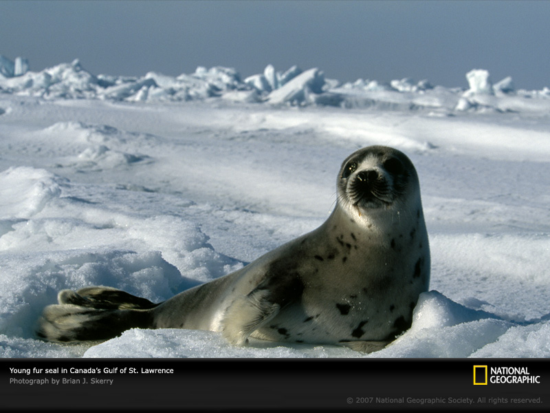 一只年轻的海豹小心注意周围的冰雪环境位于加拿大的圣•劳伦斯海湾。当海豹断奶和脱落它们的绒毛后称作:“打击者”,这样子它们把鳍状肢放在水中打击。海豹鳍状肢是圆滑的,对于海豹的猎杀者来说:“未损坏的毛皮是最重要的”。