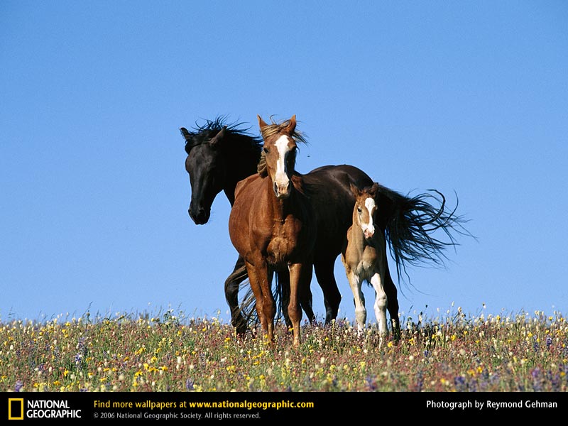 野马群在蒙大纳州的Pryor山脉奔跑通过一片野花开放的地方。