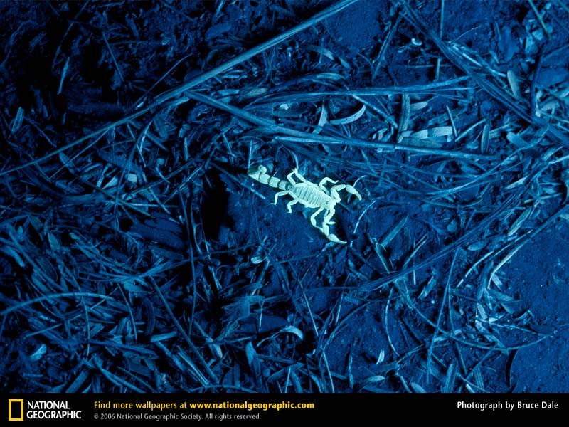 紫外线下的蝎子。夜间爬行者,一只蝎子会完美地披上伪装而不畏手电筒类的光束,但是能够发出荧光紫外线光束就会把蝎子暴露无遗,这个原因有待科学家探讨。