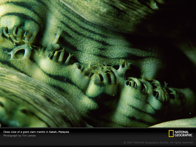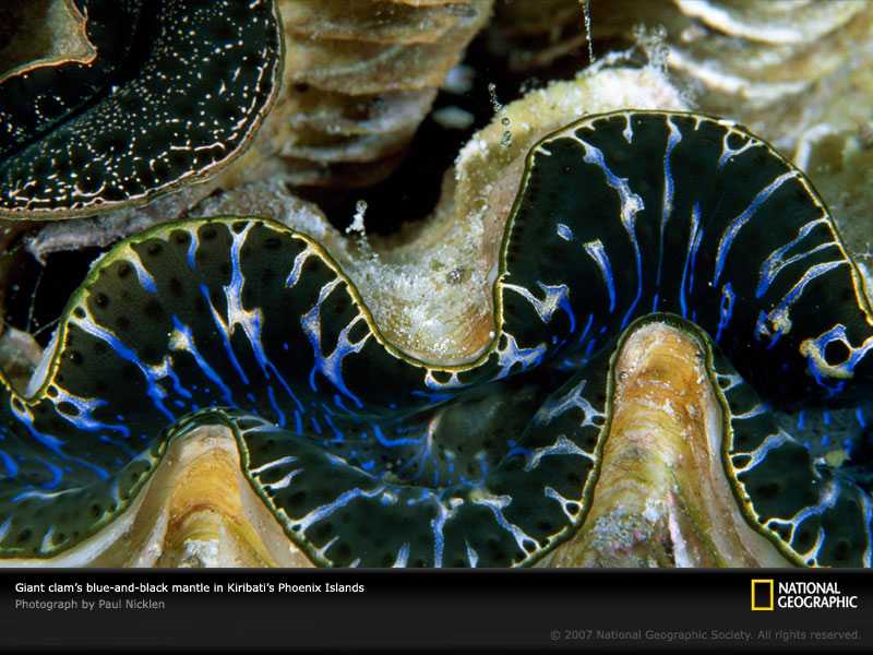 位于基里巴斯的长生岛有一只大蛤在展示它的斗篷的惊人的颜色。