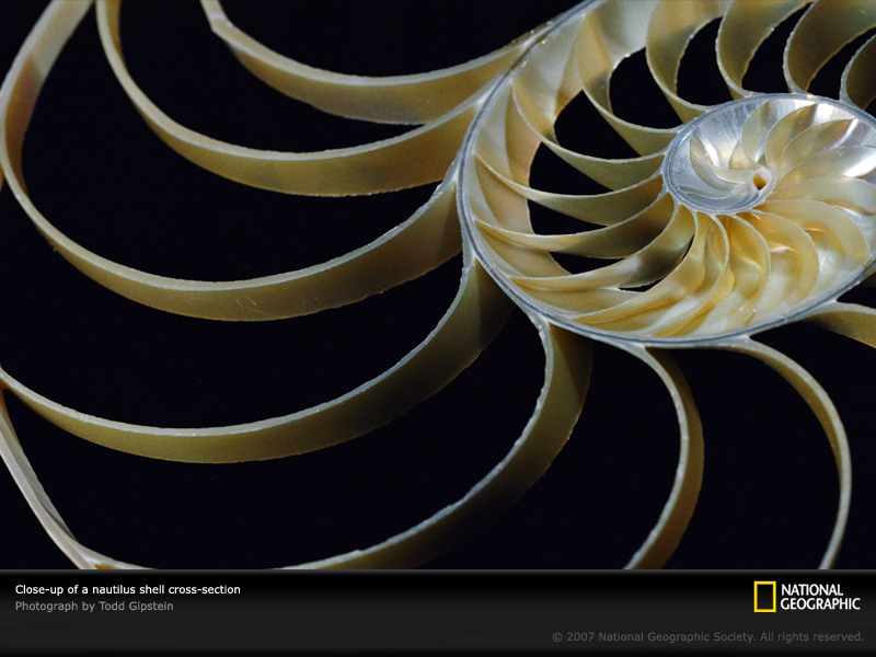 一只横截面的鹦鹉螺壳在波士顿展示螺旋形的腔,叫做照相机,这是头足动物建造为它自己因为它要成长。
