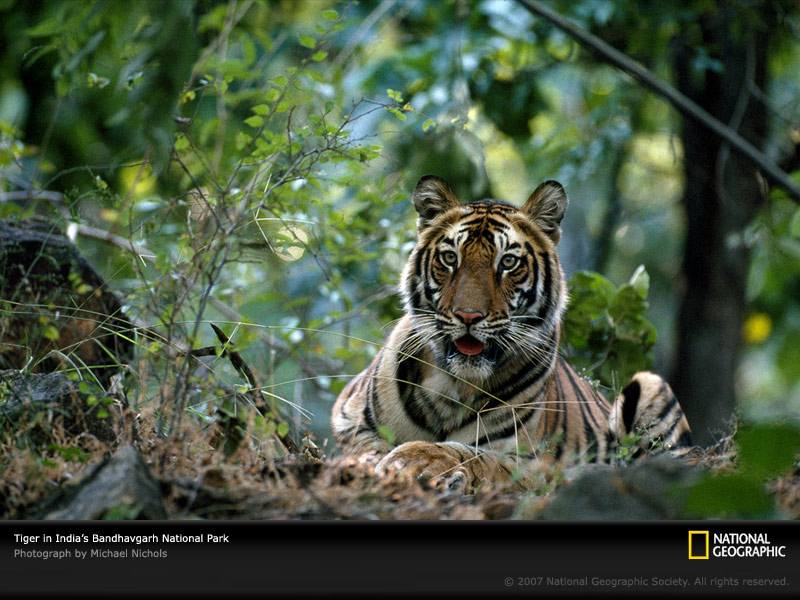 只完美的年轻的孟加拉虎摆好姿势休息在清洁的印度的Bandhavgarh国家公园。这只小虎像是Sita的后代,公园里有一只雌虎其出名的原因是猎杀的威力和她的多产繁殖。