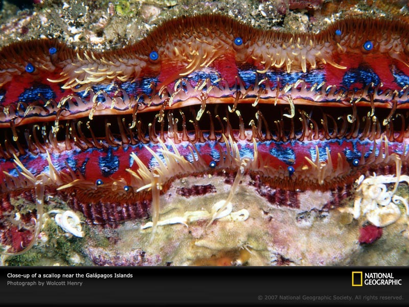扇贝显示它的灿烂的彩色覆盖物而那个蓝点是它们的多样的眼。