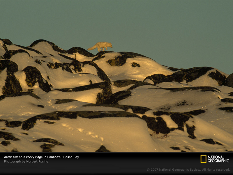 位于加拿大的哈得孙海湾有一条北极狐鬼鬼祟祟的越过一片雪地的岩石山脊。这些表面上灵敏的北部哺乳动物越来越强烈来到海湾地区,因为冬天来到北极圈时候是痛苦的穷困的。