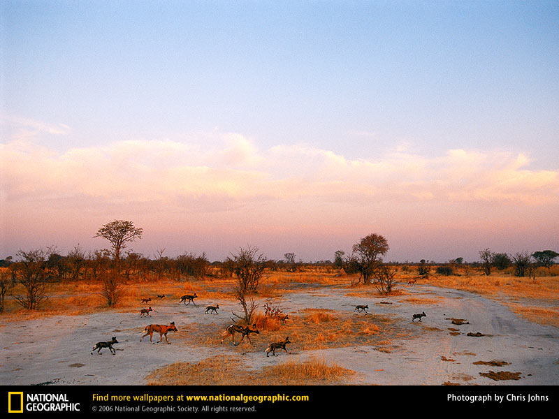 博茨瓦纳的猎狗。黄昏时间成年的狗和小狗奔跑越过泛滥平原当那Okavango三角州的九月是旱季。年轻的狗才四个月和老狗教他们最好的跟随不能掉队,但是老狗有时被痛打还很累的要为小狗刷毛,免受狮子的攻击,因而最迟返回。