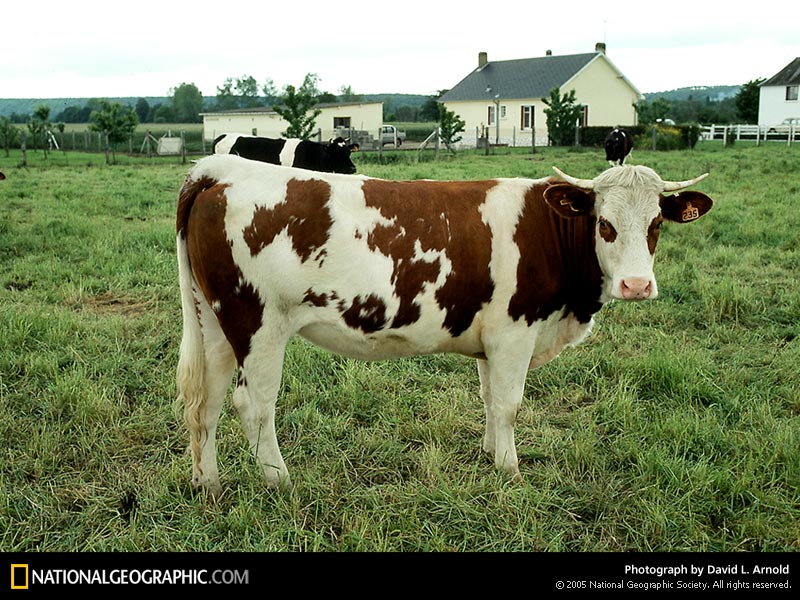 诺曼底牛,诺曼底,法国,1980年。牛站在那里注意到诺曼底的塞纳河,一个小镇在塞那河旁。小镇建立已经超过一千年的历史,海盗们航行到法国来就是沿着这条河。他们结婚后生育自己的儿女在这个地区繁荣,发展诺曼底人并从挪威离开。