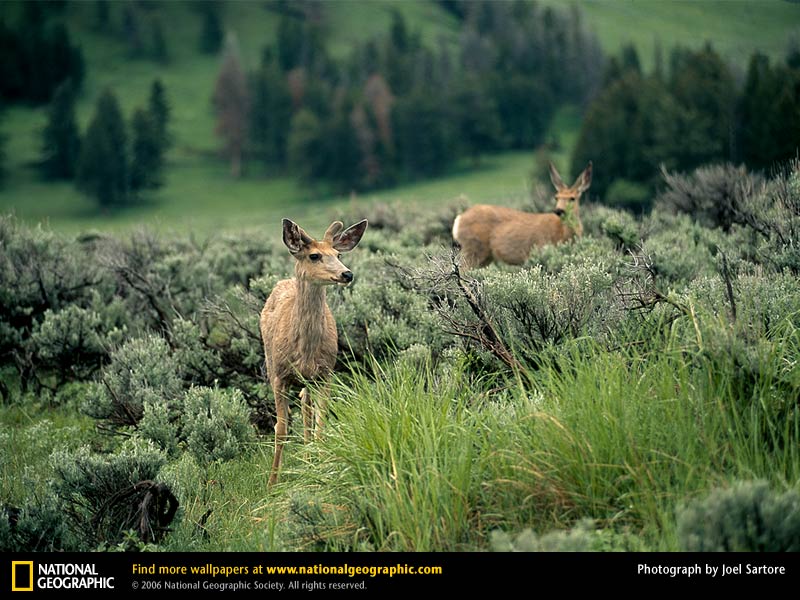 一对崛强的鹿正在注视狼群及其它掠食者站在黄石牧场国家公园。虽然它们见过狼群会选择那些老的有病的兽群,研究表明狼群首先选择最小的鹿猎杀,那些不够一岁的鹿。