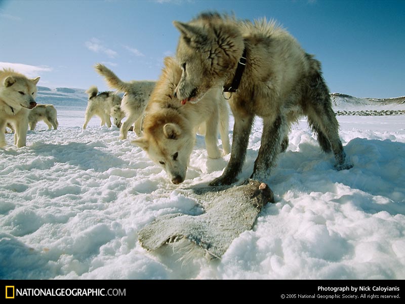 雪橇小狗,巴芬岛,加拿大。那些因纽特人喜欢说:“喝醉了的像一只狗”。这句成语来自雪橇狗吃了格陵兰鲨鱼鱼肉的举止行为,那些鲨鱼富含神经毒素。一个解毒的方法是将已经死亡的鲨鱼肉放进盐水中几天。