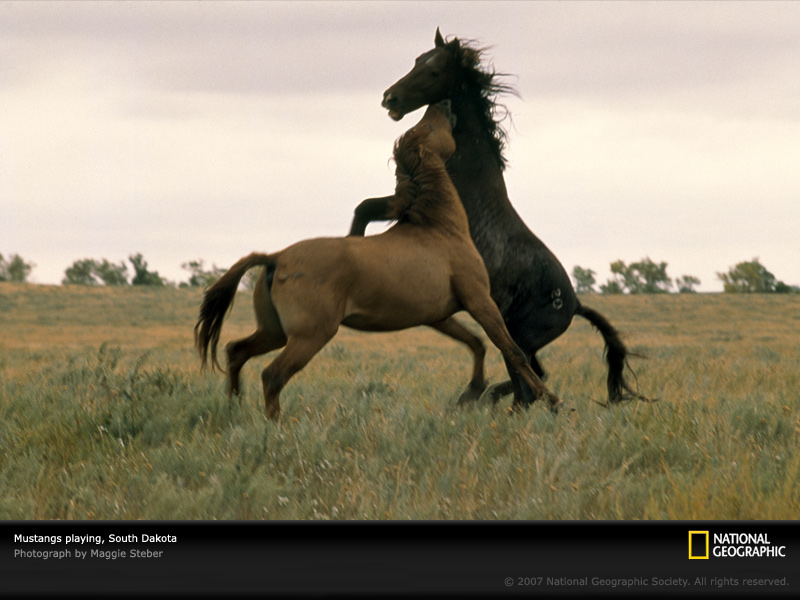 风摇曳到Lantry草原的时候,南达科他,两只野马(注明:专指――墨西哥和北美平原的野马)开玩笑地腾越。从一个祖先传下来的西班牙马群是由西班牙的征服者在16世纪带来的,野马象征一个微妙的连结物――美洲的边境的往日。研究员们评估美国境内过去有两百万以上的野马,今天那里较少约有50000只野马。