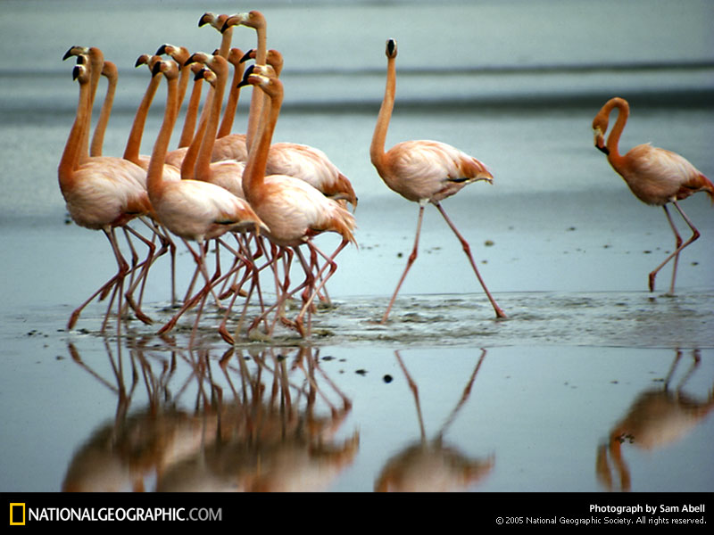 火烈鸟经常成群在一起,用很多的时间展示它们的觅食活动,它们通常是连续性群体性同步性行动。