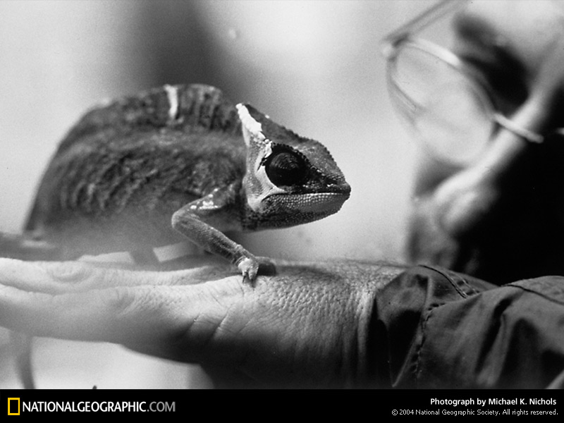 J. Michael Fay 一位野生动植物保存社会名流保存一条变色龙。Fay 忍耐一整年艰苦跋涉越过非洲的森林区从刚果到加蓬,测量的区域仍旧质朴的风景。
