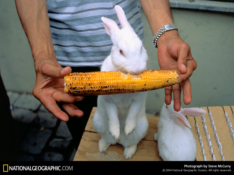 兔子们可能知道如何获得利益走进公园然后啃莴笋,但是它们通常吃的食物是绿色多叶的植物。这只被宠爱的兔子吃的是玉米在一个木板上。